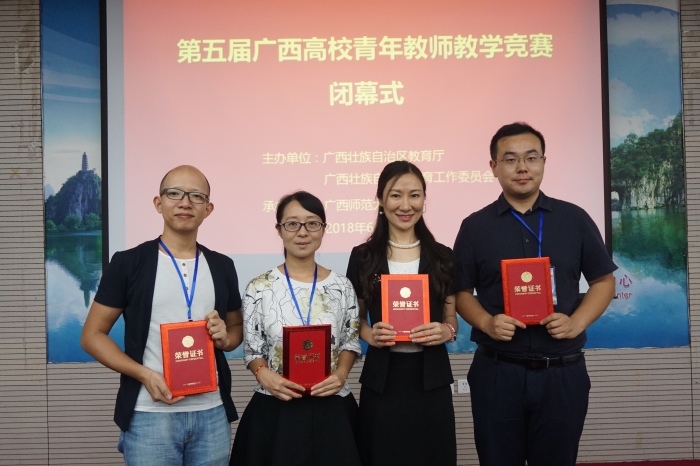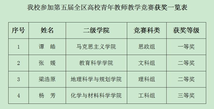 在6月29日结束的第五届全区高校青年教师教学竞赛中,我校推荐参赛的四位教师全部获奖,其中马克思主义学院谭皓老师获思政组一等奖第一名,将获得由自治区总工会颁发的广西五一劳动奖章,并代表我区参加第四届全国高校青年教师教学竞赛;教育科学学院张媛老师获文科组二等奖,地理科学与规划学院梁浩原老师获理科组二等奖,化学与材料科学学院杨芳老师获工科组三等奖。我校总成绩在参赛的34所本科院校中排名第四。